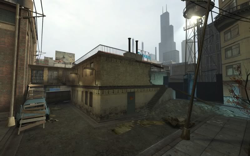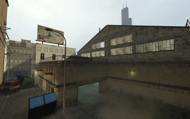 Street outside warehouse, with 3d sky.